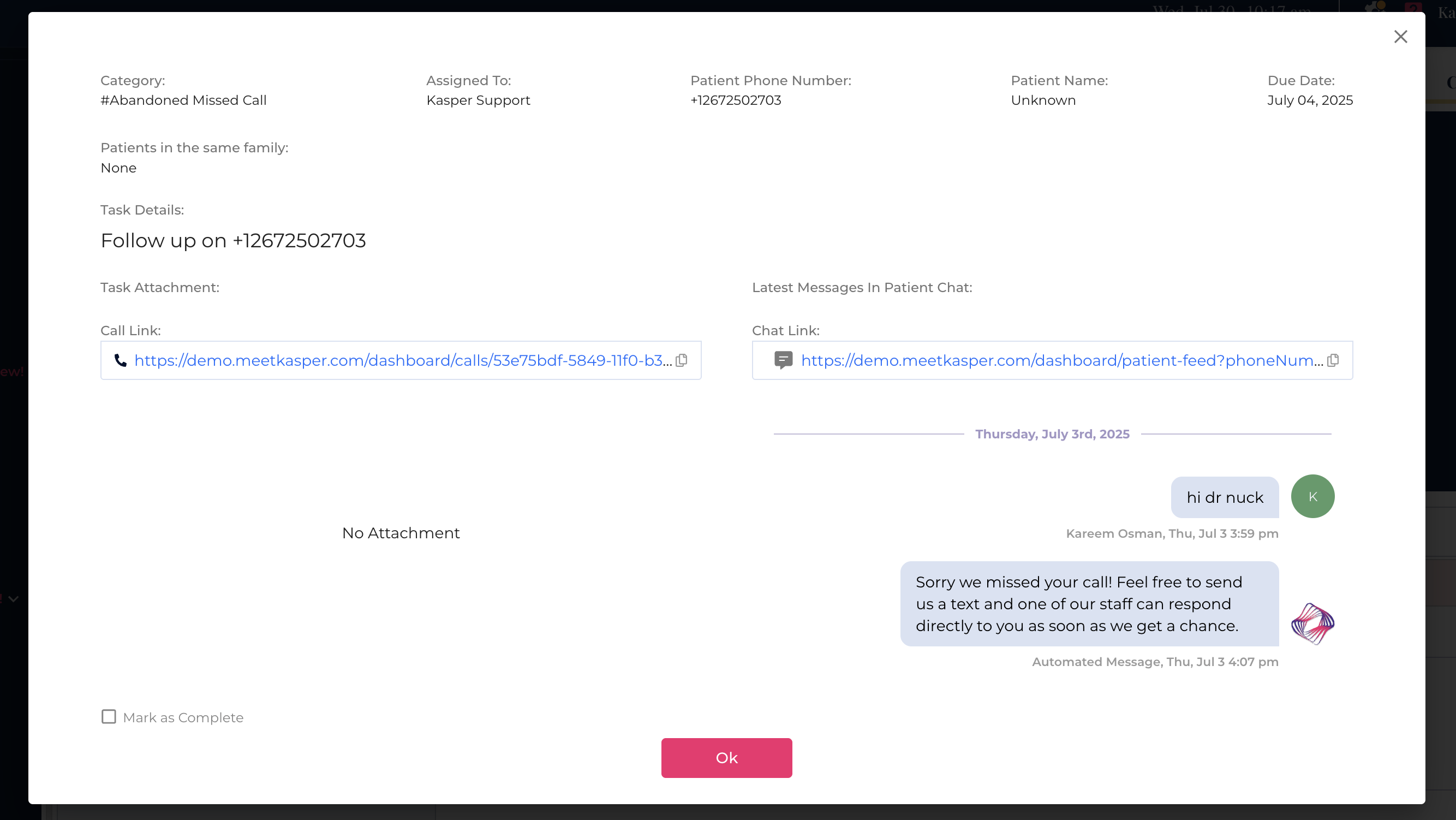 Tasks are created for missed calls that were never returned, ensuring every patient receives a timely follow-up. -