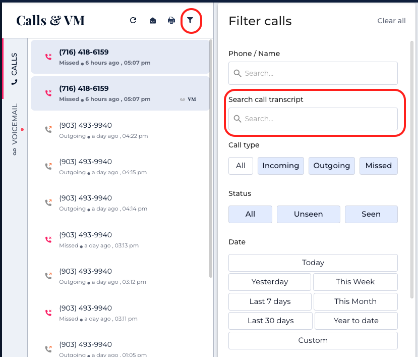 Click on the Filter Icon: Navigate to your call list and select the filter icon.