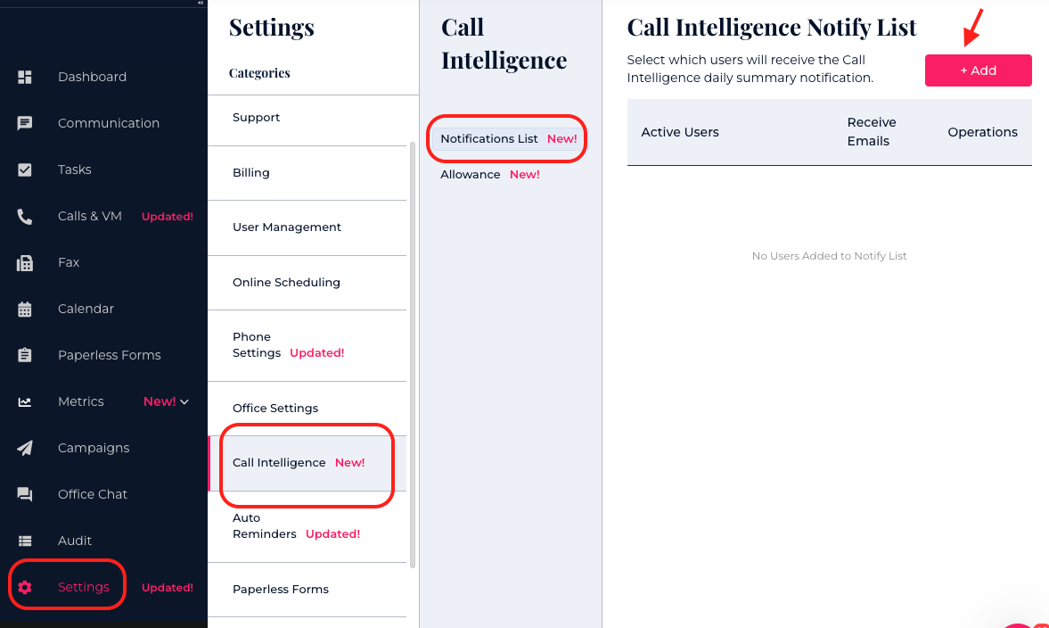 To add users, go to Settings, navigate to Call AI Settings, then Call AI Notification List, and select "Add." Enter the emails of users you want to receive daily reports.