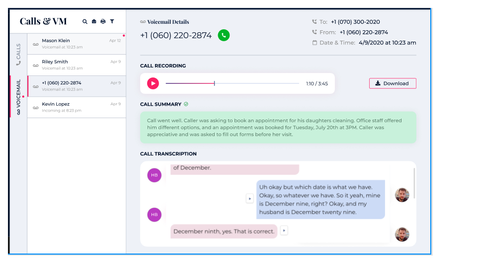 View Transcripts & Summaries: The transcript will display the conversation in text form, while the summary will provide key points and an overview of the call.