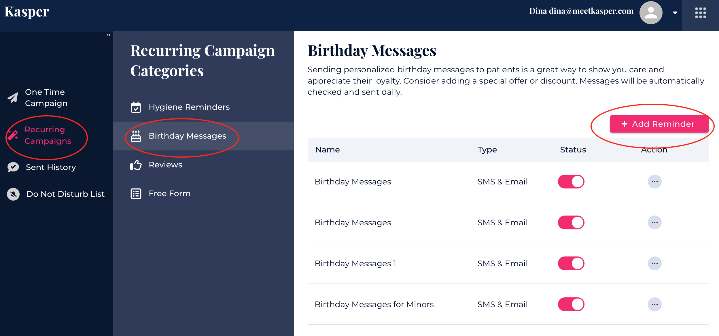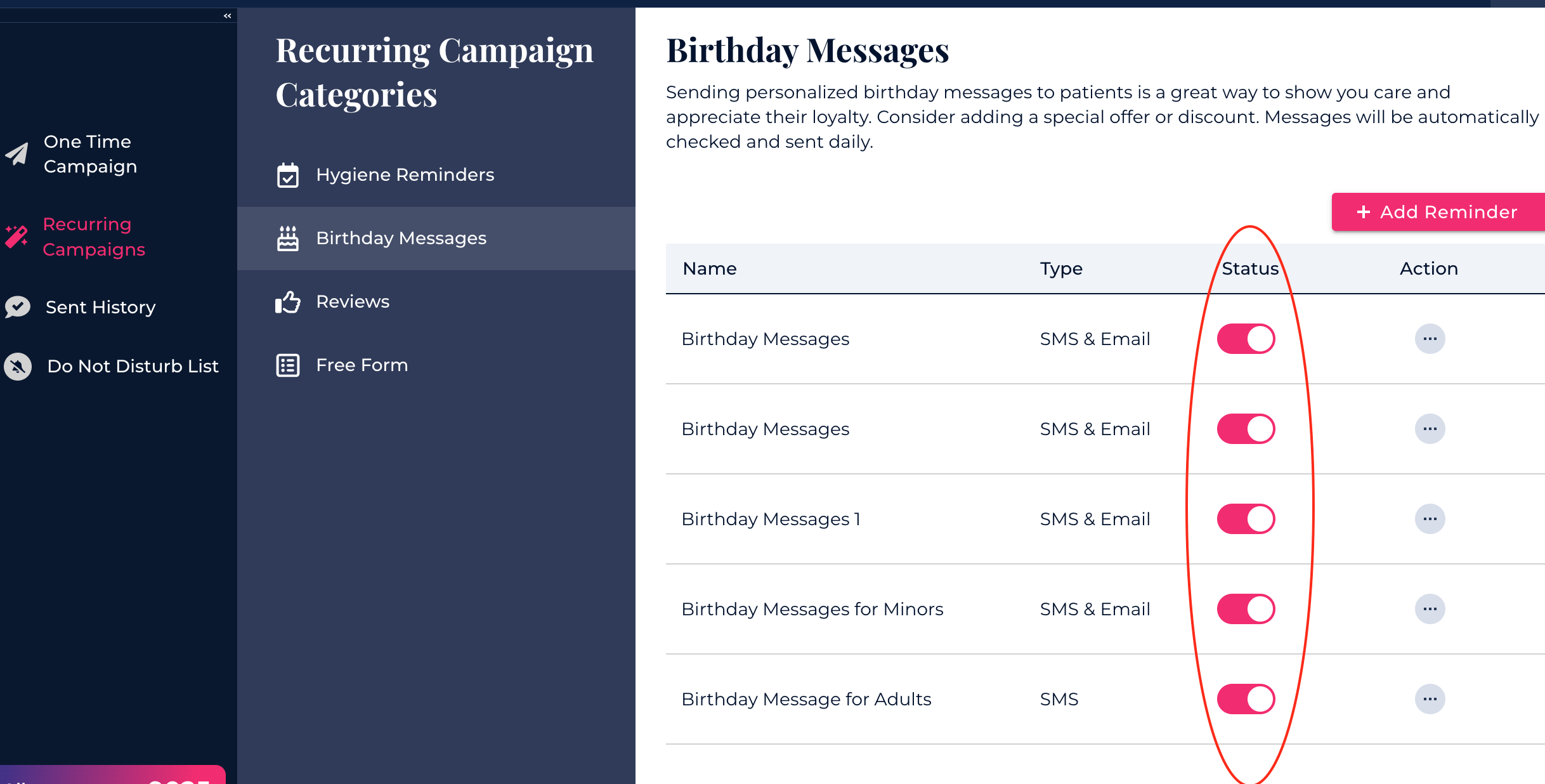 To create a new campaign, click the Add Reminder button.