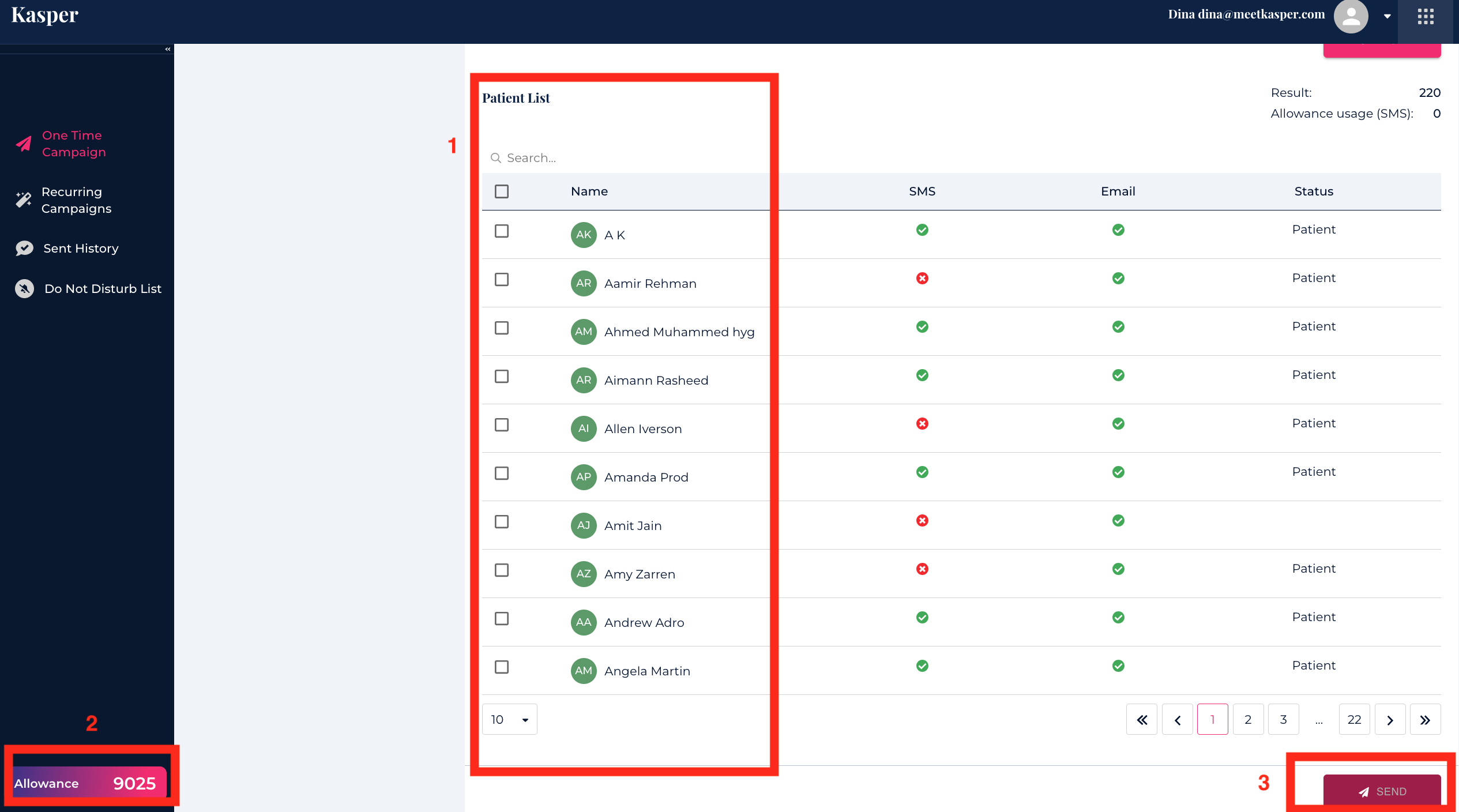 Then hit the Search button to get the list of patients that fits the selected criteria (1). Select the patients and check your message allowance (2), and then click on Send (3), to send the campaign to the selected patients.
