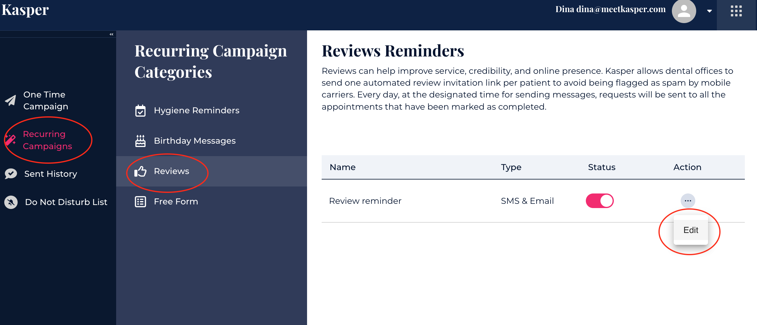 To edit the Reviews Reminders Campaigns according to your office needs, click on Edit button.