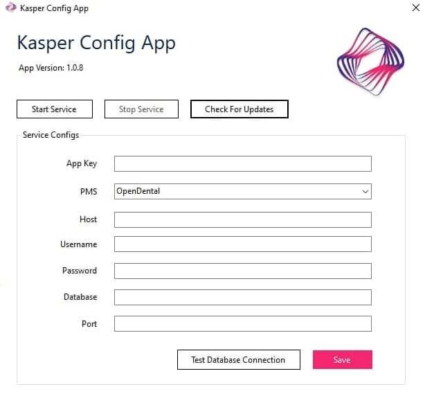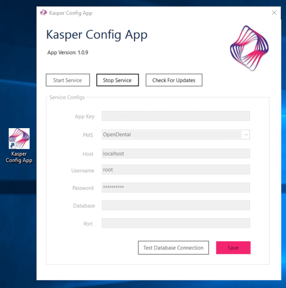 Notice how all the text fields (such ass App Key, PMS, Host, and others) are currently greyed out, along with the "Start Service" button but the "Stop Service" button is in black. This indicates that the Kasper client has successfully connected to our servers. Should you press the "Stop Service" button, the client would look something like this