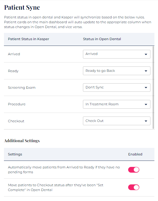 In the "Status in Open Dental" column, you can customize how a patient's status in Kasper corresponds to their status in Open Dental. Once these settings are configured, whenever you move a patient to a different stage on the Dashboard, their status in Open Dental will automatically synchronize accordingly.