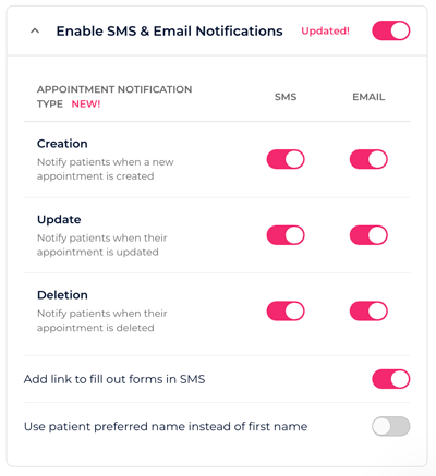 If you would like to include a link for patients to complete outstanding or new forms, ensure this option is enabled.
