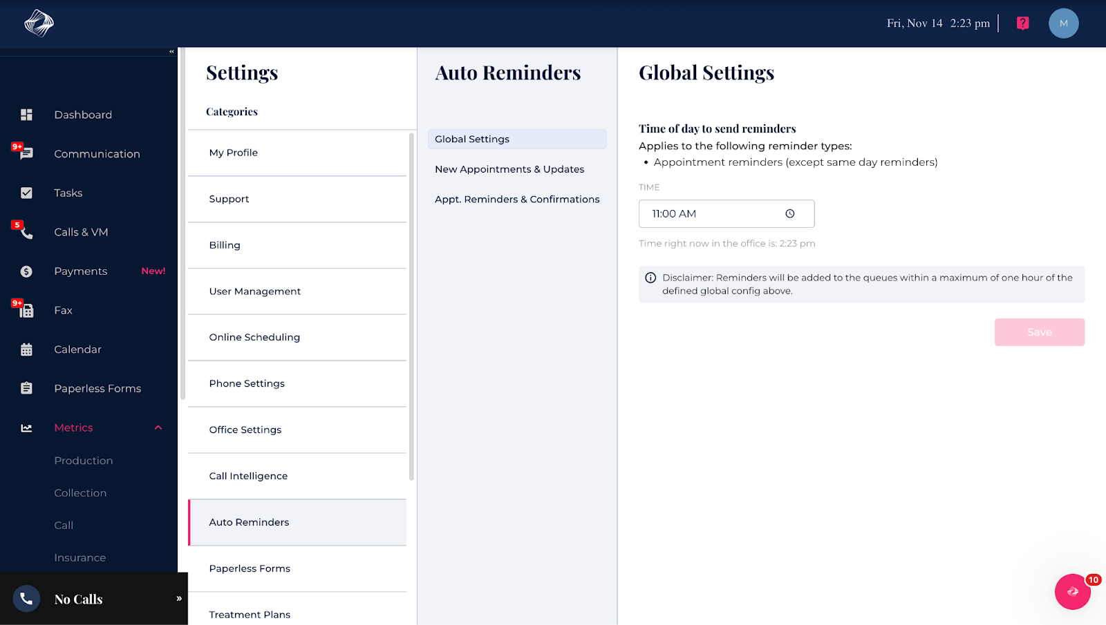 This step is to establish the time of day when you'd like all your patients to receive their general reminder emails and/or SMS. Please choose your preferred time and save your selection.