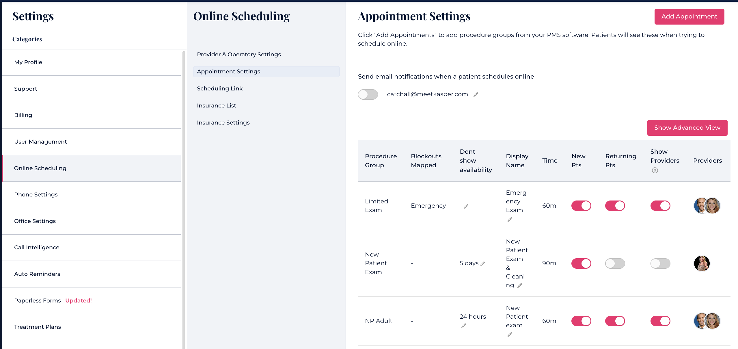The procedure length for the appointments and availability of the providers on Open Dental will sync into Kasper automatically.