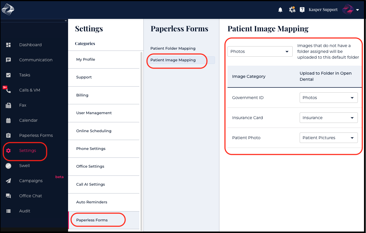 By default, all Kasper uploaded images will be saved in the "Photos" folder under the Imaging tab in Open Dental.