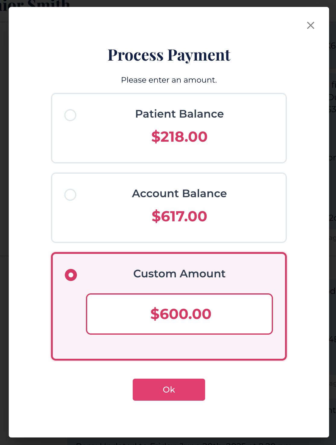 Use custom amounts if patients want to pay in advance or make partial payments.