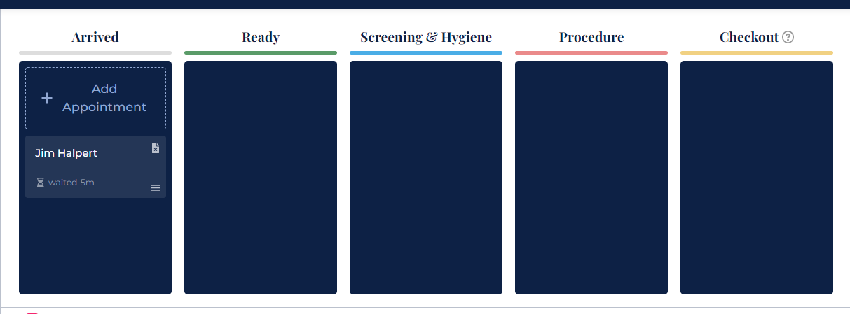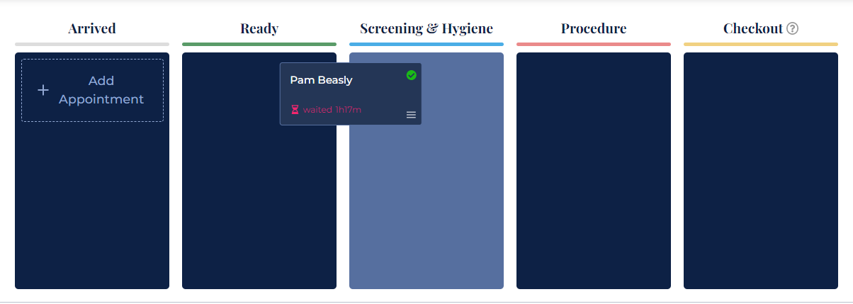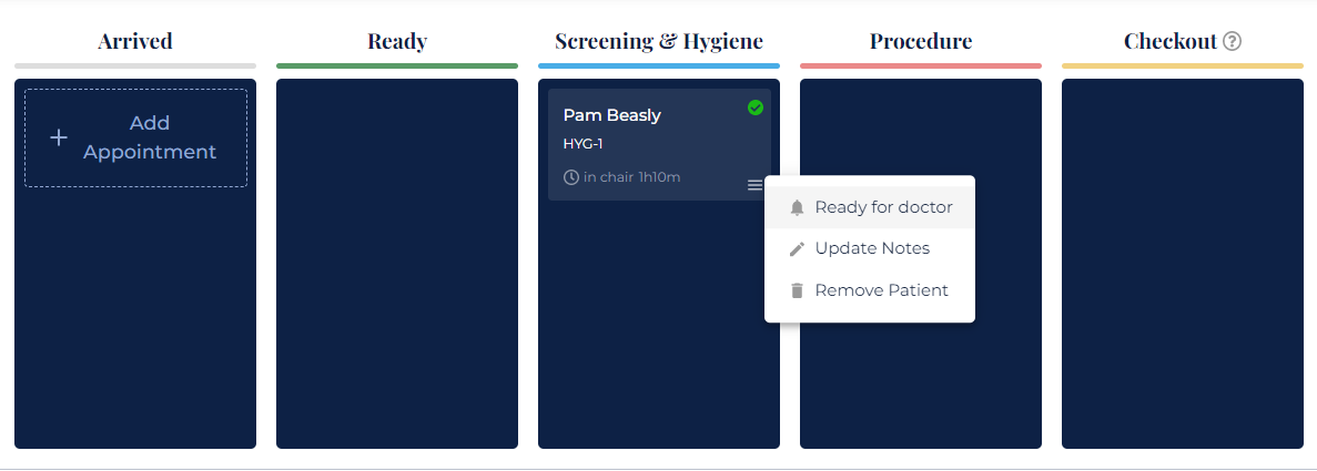 After the patient is taken back, you can simply drag and drop them into the appropriate column, such as "Hygiene" or "Procedure," on the dashboard. This helps organize and categorize patients based on their status or appointment type.