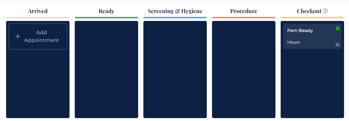 Once the patient is set as complete in Open Dental, they will be automatically moved to the ‘Checkout’ column.