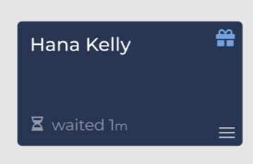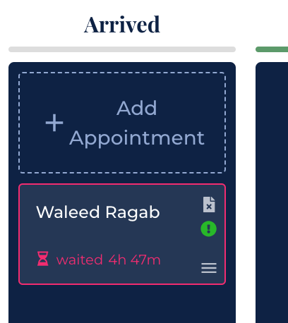 The hourglass icon on the appointment card represents the waiting time for the patient.