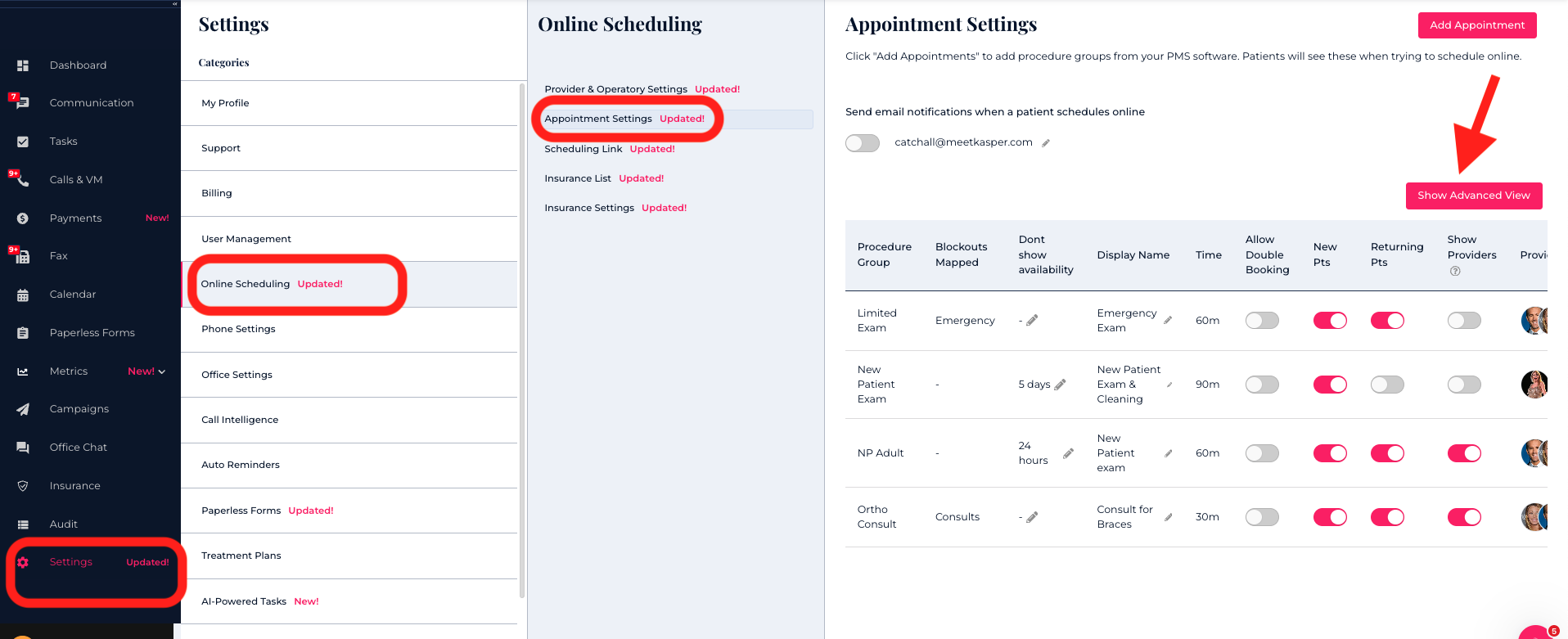 For complex setups, document your provider, operatory, and appointment type configuration before contacting Kasper Support.