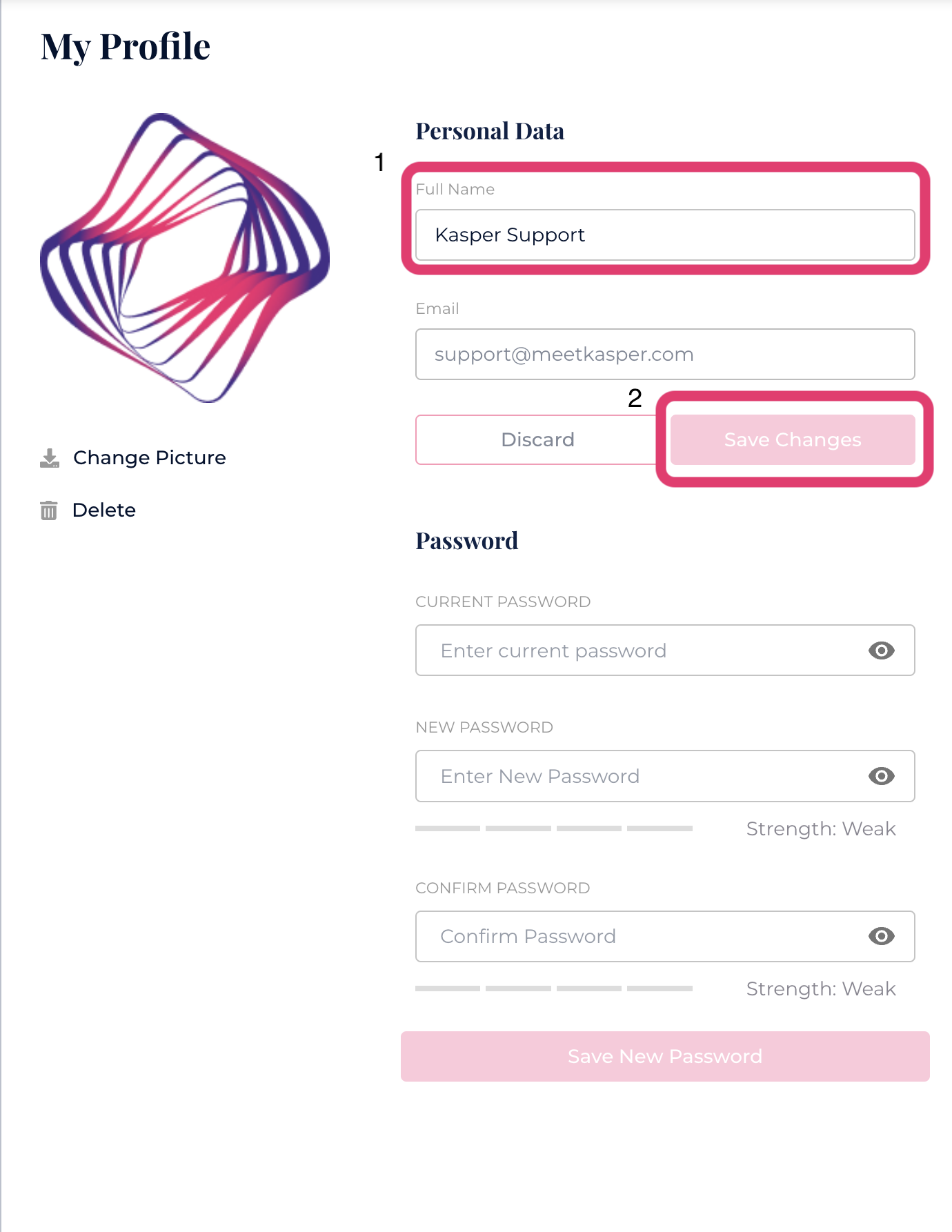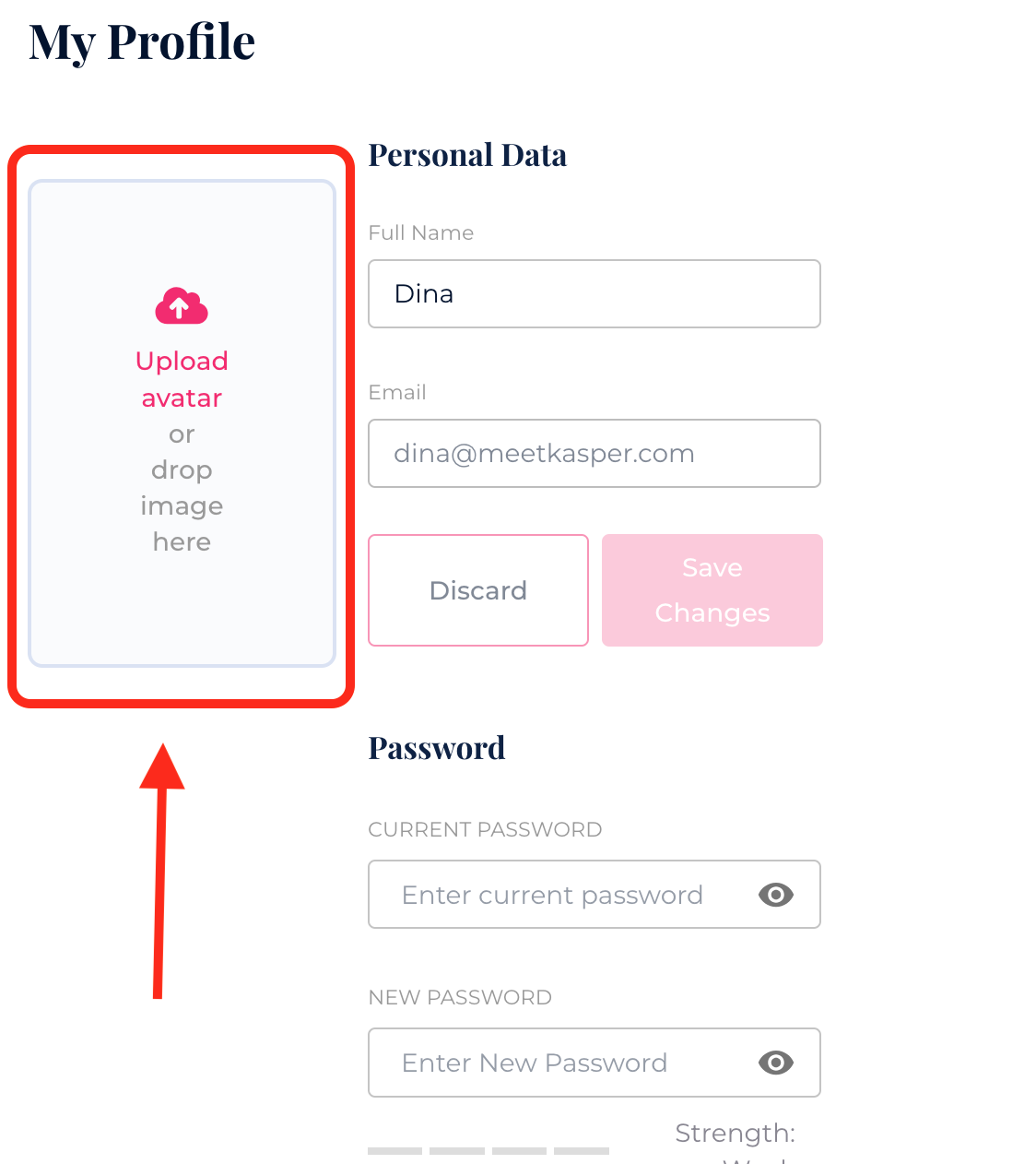 To add or change your profile picture, you can either upload an image or simply drag and drop your chosen image into the designated area. This feature allows you to personalize your Kasper profile and enhance your user experience.