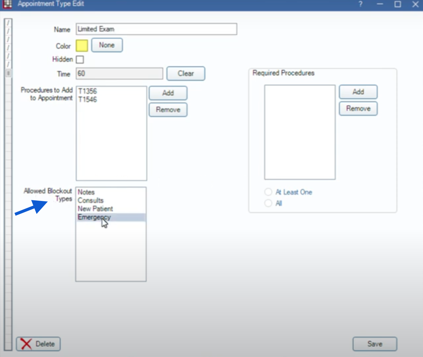 For example, you might assign a "Limited Exam" appointment to be scheduled during an "Emergency" blockout period.