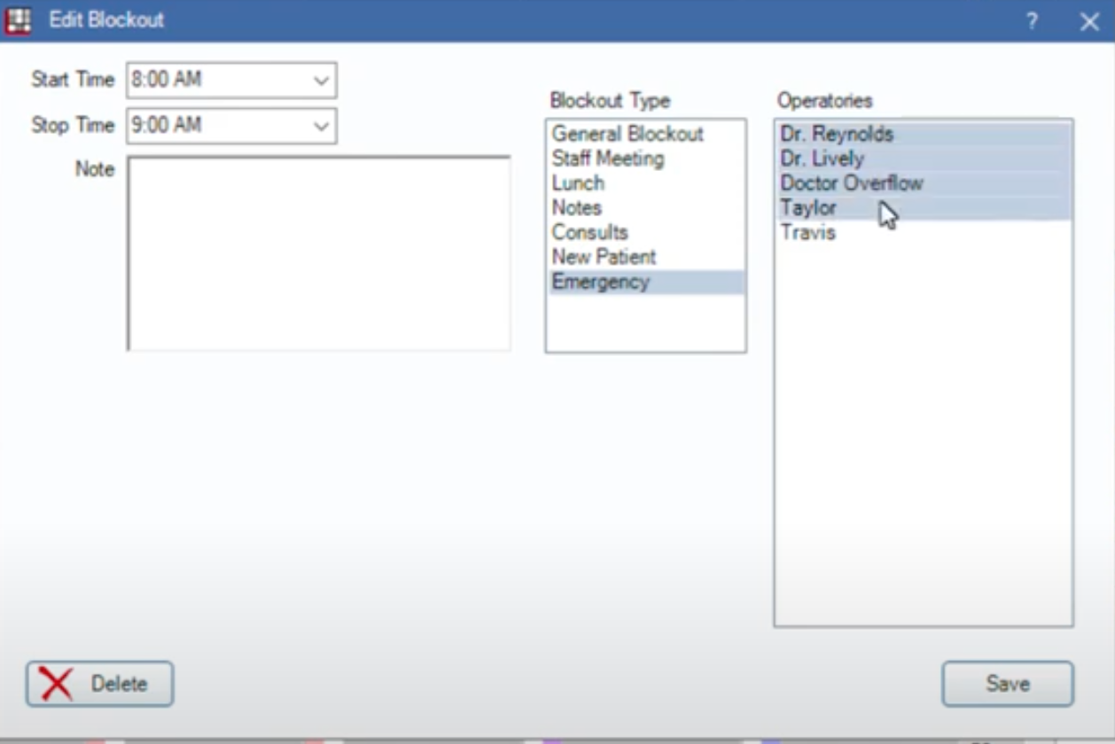 Customize the blockout by selecting the blockout type, the desired Operatories (you can choose more than one), and the start and stop times.