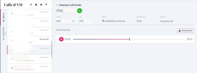 2.) Any applicable incoming/outgoing phone calls, missed calls and voicemails can be played back and downloaded to be used for quality assurance, training purposes and other use cases.