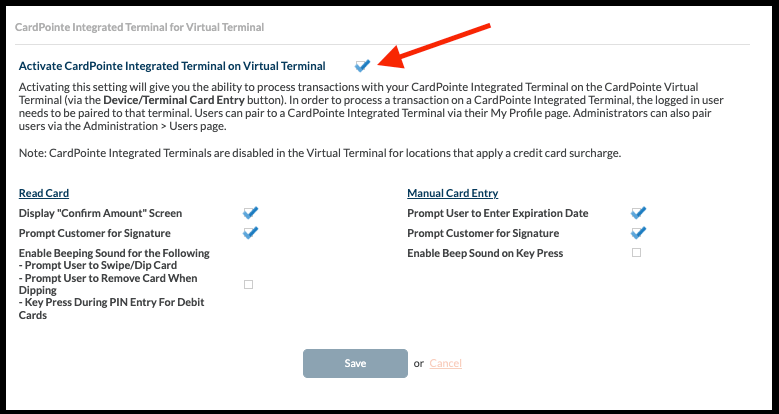 Administration- Virtual terminal- end of page, make sure "Activate CardPointe Integrated Terminal on Virtual terminal" is checked