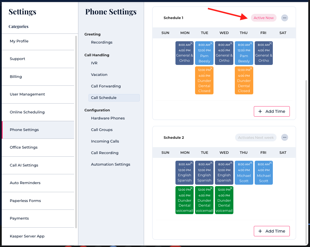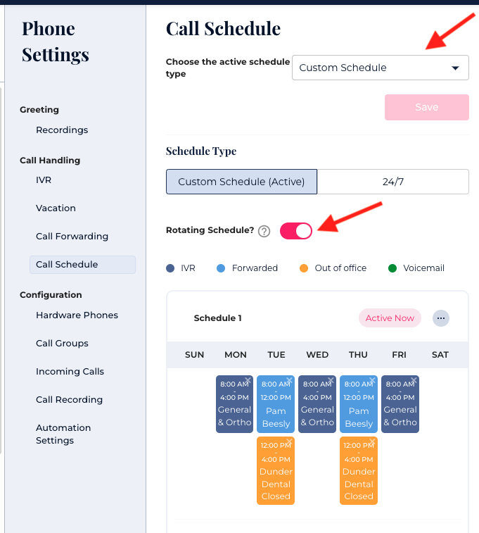 The Rotating Incoming Call Schedule feature is designed to empower your office with flexibility and efficiency. With the ability to create up to two custom rotating schedules, tailored to your office's specific needs.