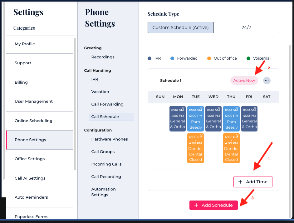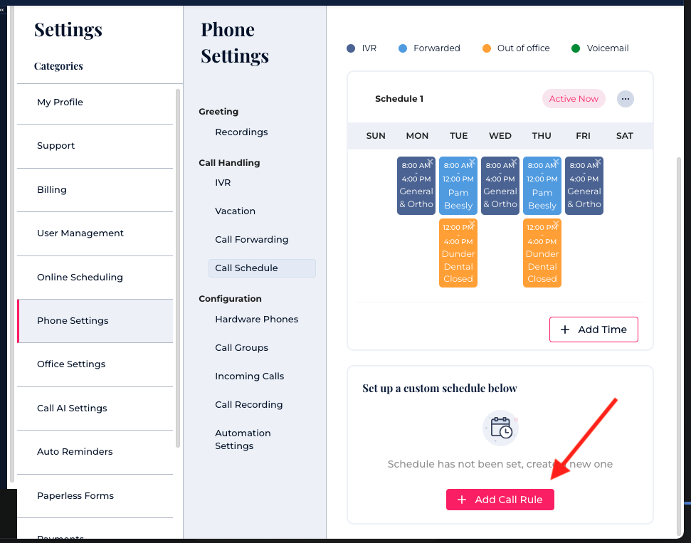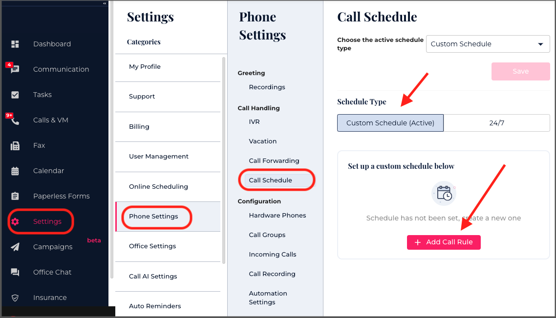 Once you're in the Call Schedule section, choose the Custom Schedule option. This will enable you to create personalized schedules tailored to your office's needs.