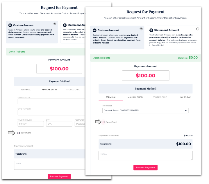 This will securely store the payment card for future transactions for this patient and for any patients with the same phone number.