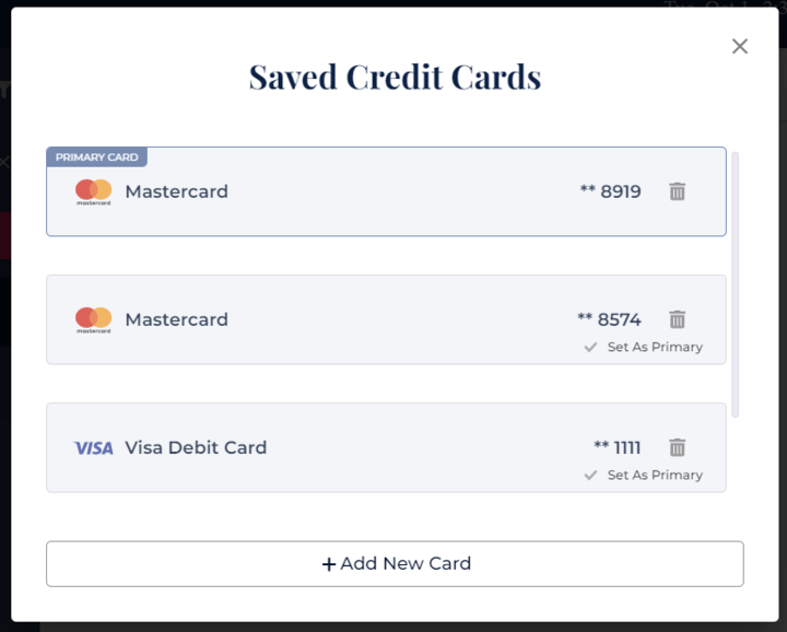 The primary "Default" card will be labeled as "Primary card". To set a different card as primary, simply click on "Set as Primary".