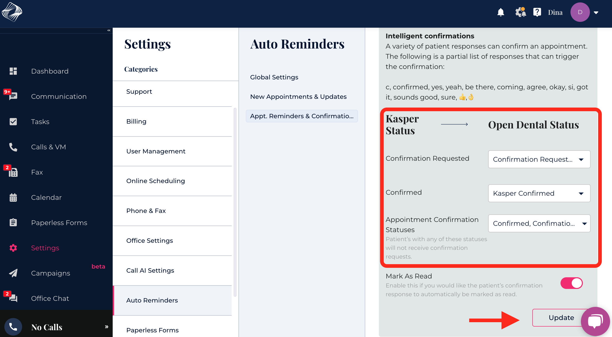 Kasper automatically updates appointments in Open Dental when a patient confirms an appointment via SMS.