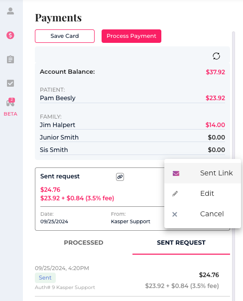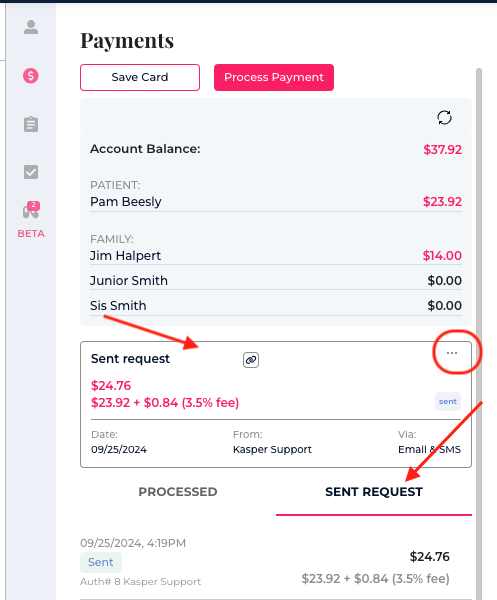 If you need to resend a payment link, adjust the payment amount, or delete a request, click the three dots in the top right corner of the specific sent request. This will open options to make the necessary changes.
