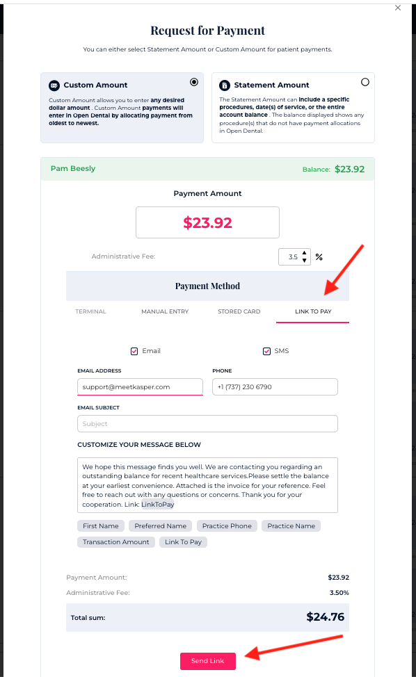 When you're ready to process a payment, simply click on the "Link to Pay" option. From here, you can choose how to send the payment link—via SMS, email, or both. Additionally, you can customize the subject line and message content before sending the payment link to ensure clear communication with your patient.
