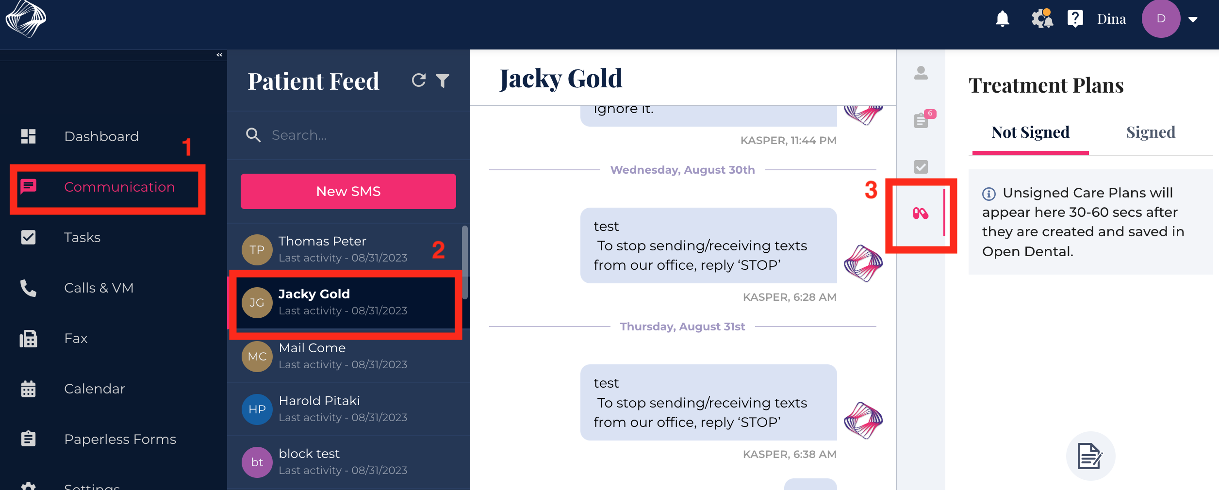 All Active+Saved unsigned treatment plans in Open Dental will sync with Kasper under the Unsigned section in the Treatment Plan tab. You can access unsigned treatment plans, choose to show them to the patient or send it to them directly via SMS or email.