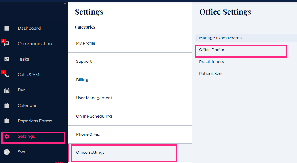 In order to update your office number, head over to "Settings" in the left-hand menu bar -> "Office Settings" -> "Office Profile".